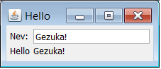 Egy ablak fejléccel, benne egy Hello Geza felirattal, és mellette egy Ok gombbal: